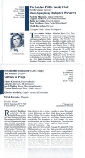 Albanian Radio & TV Symphony Orchestra: Tirana Concert Hall (Charpentier, Bartók, Brahms 4th) • Anhaltische Philharmonie Dessau: Dessau Anhaltisches Theater (Mozart “Prague”, Stravinsky Fire Bird Suite) • Arad State Orchestra: Arad Palais de Culture (Wagner, Enescu, Liszt, Ravel) • Belarusian State Philharmonic Orchestra: Minsk Philharmonic Concert Hall (Mozart, Bruckner 4th) • Bergische Symphoniker: Remscheid Schloss Burg (Biber, Haydn, Ives, Schubert 3rd) • Bochumer Symphoniker: Bochum Stadthalle Wattenscheid (Beethoven, Bartók, Tschaikowsky 4th) • Bohuslav Martinu Philharmonic Orchestra: Zlin Congress Centre (Bach Weihnachts-Oratorium) • Choeur de la Suisse Romande: Dresden Kreuzkirche (Honegger Le Roi David / Dvorák Te Deum) • Estonian National Symphony Orchestra: Berlin Konzerthaus, Tallinn Philharmonic Hall (Sibelius 2nd etc. / Bruckner 9th, Berg Wozzeck etc.) • Favorit-und-Capell-Chor Leipzig [MDR Radio Chamber Choir]: Chemnitz Schlosskirche, Kloster Osek (Bach Hohe Messe h-moll) • Filarmonica Moldova Iasi: Iasi Philharmonic Hall (Bach, Dvorák 9th / Brahms Requiem) • Filharmonia Lubelska: Lublin Philharmonic Hall (Weber, Franck, Brahms 1st) • Folkwang Kammerorchester Essen: Essen Villa Hügel (R. Strauss, Schoeck, Dvorák) • Frankfurter Museumsorchester: Frankfurt Opernhaus (Ballettabend Bach, Stravinsky) • Gewandhauschor Leipzig: Chemnitz Schlosskirche, Kloster Osek (Bach) • Göttinger Symphonie-Orchester: Göttingen Stadthalle (Elgar, Schubert C-dur) • Hamburger Symphoniker: Hamburg Laeiszhalle (C.P.E.Bach, Haydn, Ives) • Hessisches Staatsorchester Wiesbaden: Wiesbaden Kurhaus (Bellini, C.P.E. Bach, R.Strauss “Tod und Verklärung”) • Janácek Philharmonic Orchestra Ostrava: Dresden Kreuzkirche (Kunad, Janácek Glagolitische Messe) • Krakow Philharmonic Orchestra: Krakow Philharmonic Hall (Grieg, Schumann, Sibelius 2nd) • Liepaja Symphony Orchestra: Liepaja Concert Hall (Haydn, Dvorák, Brahms Haydn Variations) • Lithuanian Chamber Orchestra: Vilnius Lithuanian National Philharmonic Concert Hall (Haydn, Mozart, Mendelssohn 1st) • Lódz Symphony Orchestra: Lódz Philharmonic Hall (Fibich, Bartók, Enescu, Kodály) • Magdeburgische Philharmonie: Magdeburg Theater (Bach Suite no. 4, Mozart “Haffner” etc.) • Münchner Symphoniker: München Herkulessaal der Residenz (Beethoven 7th etc.) • Musica Viva Ensemble Dresden: Augsburg, Berlin Konzerthaus, Dresden Staatstheater, Leipzig, Rostock, Schwerin (nearly all important Music for Chamber Ensemble from Schoenberg to Boulez etc.) • NDR Radiophilharmonie Hannover: Hannover NDR Radio Konzertsaal (Vivaldi, Wagner, Liszt) • Niederösterreichisches Tonkünstlerorchester: Wien/Vienna ORF RadioKulturhaus, other places in Austria (20th century Austrian Composers; Webern Passacaglia, Mozart “Prague”) • Nis Symphony Orchestra: Nis Concert Hall (Gluck, Mendelssohn, Brahms 1st) • Norddeutsche Philharmonie Rostock: Prague Rudolfinum (Beethoven, Dvorák, Shostakovich 5th) • Nordwestdeutsche Philharmonie Herford: Herford Orchestersaal (NDR production Mussorgski/Shostakovich) • Odense Symphony Orchestra: Copenhagen Royal Theatre (Beethoven, Nielsen) • Oldenburgisches Staatsorchester: Oldenburg Staatstheater (Mozart, Bartók, Reger Mozart Variations) • Opera Classica Europa: (Verdi-Wagner Gala / Mozart Zauberflöte / Bizet Carmen) • Orchester des Staatstheaters Darmstadt: Darmstadt Staatstheater (Flammer, Mozart, C. Franck Symphonie) • Orchester Musikkollegium Winterthur: Winterthur Stadthalle (Poulenc, Mozart) • Orchestra of National Opera Theatre Constanta: Opera Classica (Mozart Zauberflöte) • Orchestre de Chambre de Genève: Chemnitz Schlosskirche, Kloster Osek (Zelenka, Schoeck, Bach) • Orquesta y Coro del Teatro Cafam de Bellas Artes Bogotá: Bogotá Teatro de Bellas Artes (New Year´s Concert) • Oslo Kammerkor: Chemnitz Opernhaus, Kloster Osek (Bach, Zelenka, Mozart etc.) • Philharmonie Südwestfalen: Langen Stadthalle / Limburg Stadthalle (Chopin, Mendelssohn, Bruckner) • Philharmonischer Chor Dresden: Dresden Kreuzkirche / Dresden Schauspielhaus (Mahler 2nd / Grieg Peer Gynt) • Philharmonisches Orchester Cottbus: Cottbus Theater (Haydn, Bruckner 3rd) • Philharmonisches Orchester der Landeshauptstadt Kiel: Kiel Schloss (Kunad, Händel Dettingen TeDeum) • Philharmonisches Orchester Zwickau: Zwickau Stadthalle (Glinka, Tschaikowski, Debussy La Mer) • Plovdiv State Philharmonic Orchestra: Plovdiv Philharmonic Hall (Beethoven, Sibelius) • Prager Smphoniker: Dresden-Kreuzkirche (Dvorák Requiem / Honegger / Dvorák Te Deum) • Prague Philharmonic Choir: Dresden-Kreuzkirche (Bruckner Messe e-moll / Janácek Glagolitische Messe / Beethoven Missa Solemnis / Dvorák Requiem etc.) • Radio Symphonie Orchester Pilsen: Pilsen Konzertsaal, Erlangen, Viersen etc. (Flammer, Schumann, Dvorák 8th / Mendelssohn “Schottische” etc.) • Radio Symphony Orchestra Prague: Dresden Kreuzkirche (Beethoven Missa Solemnis) • Radio Symphony Orchestra Warszawa: Dresden Kreuzkirche (Verdi Requiem) • Radio-Sinfonieorchester Stuttgart des SDR: Stuttgart SDR Radio Musiksendesaal (Mozart Ouverturen, Dvorák Serenade) • Residentie Bachkoor Den Haag: Chemnitz-Schlosskirche, Kloster Osek (Bach) • Rhein-Main-Philharmoniker: Opera Classica Europa (Bizet Carmen) • Rundfunk-Sinfonieorchester Saarbrücken: Saarbrücken SR Radio Konzertsaal (Bartók Orchestra Pieces) • Rundfunkchor Prag: Dresden Kathedrale (Dvorák Stabat Mater) • Rzeszów Philharmonic Orchestra: Rzeszów Philharmonic Hall (Bach, Mozart, Mahler 1st) • Silesian Philharmonic Orchestra: Katowice Philharmonic Hall (R.Strauss, Laló, Dvorák 9th) • Slovak Chamber Orchestra: Tour North Italy (European Masterpieces) • Staatsorchester Rheinische Philharmonie: Birkenfeld Stadthalle (Beethoven 3rd etc.) • Staatsphilharmonie Brünn/Brno: Dresden Kreuzkirche (Mahler 2nd) • Städtisches Orcheste